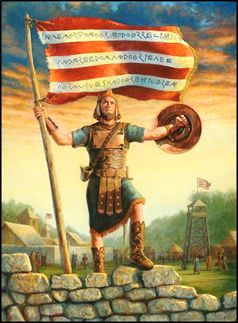 Captain Moroni in the Book of Mormon, like Pres. Oaks, he was a defender of liberty on every front. Here he is waving the “Title of Liberty” flag he fashioned in a time of war and persecution, as described in Alma 46, in the Book of Mormon, image from www.BookofMormonEvidence.org: