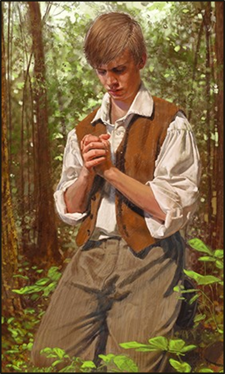 At length I came to the conclusion that I must either remain in darkness and confusion, or else I must do as James directs, that is, ask of God. . . . So, I retired to the woods to make the attempt. . . . I kneeled down and began to offer up the desires of my heart to God. I had scarcely done so, when immediately I was seized upon by some power which entirely overcame me, and had such an astonishing influence over me as to bind my tongue so that I could not speak. Thick darkness gathered around me, and it seemed to me for a time as if I were doomed to sudden destruction. But, exerting all my powers to call upon God to deliver me out of the power of this enemy which had seized upon me . . . Just at this moment of great alarm, I saw a pillar of light exactly over my head . . . I saw two Personages, whose brightness and glory defy all description, standing above me in the air. One of them spake unto me, calling me by name and said, pointing to the other—This is My Beloved Son. Hear Him! (Joseph Smith History 1:13-17 excerpts).