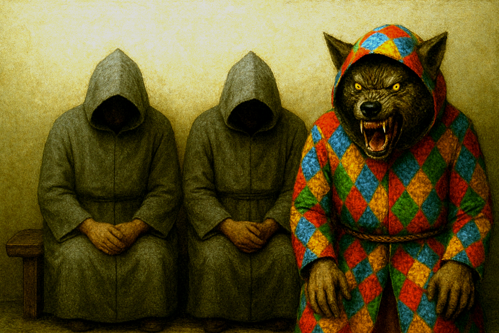 The message was pretty clear to me. Evil is real and really wants to hurt and destroy us, but this wolf couldn’t get up from this bench and could only threaten me. What looks like a clown suits symbolizes that we can laugh at Satan and his evil minions—they have no real power!
